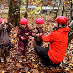 I Løvspring prioriterer vi natur og idræt, hvor klatring i 2023 blev endnu en kerneydelse til vores skovedage og haldage. Klatring giver Løvspring en helt ny dimension og andre muligheder for at etablere vilde, risikofyldte og anderledes pædagogiske aktiviteter i vores hverdag. Vi kan lave kæmpegynger, klatrebaner, High Rope baner, svævebaner, rappelling, rebklatring, kassestabling, træklatring, vægklatring og meget mere. Vi har stor fokus på trivslen, den positive udvikling og sikkerheden. Sværhedsgraden i aktiviteterne justeres afhængig af hvilken aldersgruppe og hvor børnene er i deres udvikling. I Løvspring kan vi gennem klatring skabe et pædagogisk lege- og læringsmiljø, som kan udvide børnenes deltagelsesmuligheder på tværs af alder, køn, social og kulturel baggrund.
