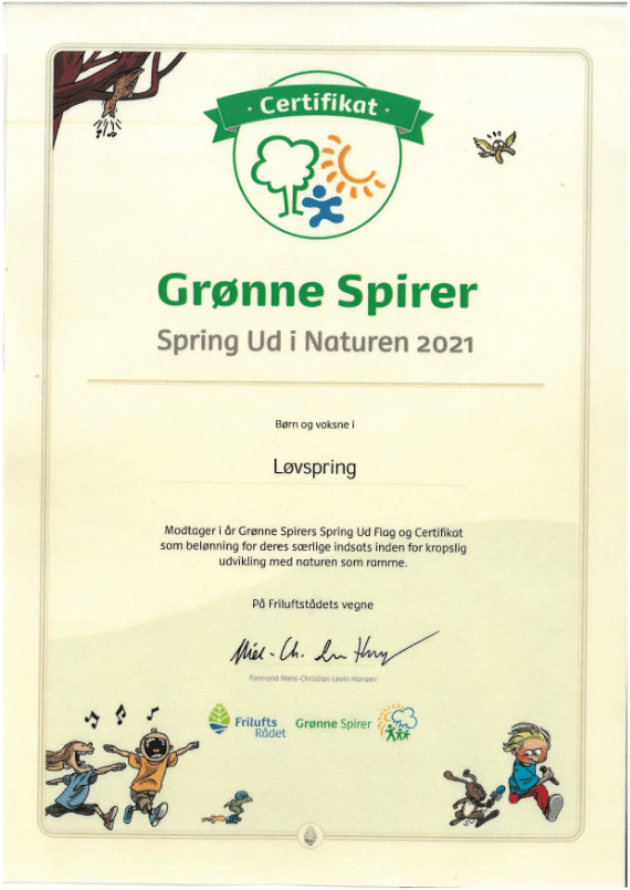 Løvspring har ‘De Grønne Spirers’ blå flag. I Løvspring arbejder vi pædagogisk og målrettet med at give børnene naturdannelse – både igennem viden om naturen, indblik i at værne om naturen og hvordan vi aktivt kan bruge naturen. Grønne Spirer er friluftsrådets landsdækkende grønne mærkningsordning for børneinstitutioner. Med Grønne Spirer ønsker vi at markere det sunde udeliv, hvor alle børnegrupper har en-to ugentlige skovdage.
